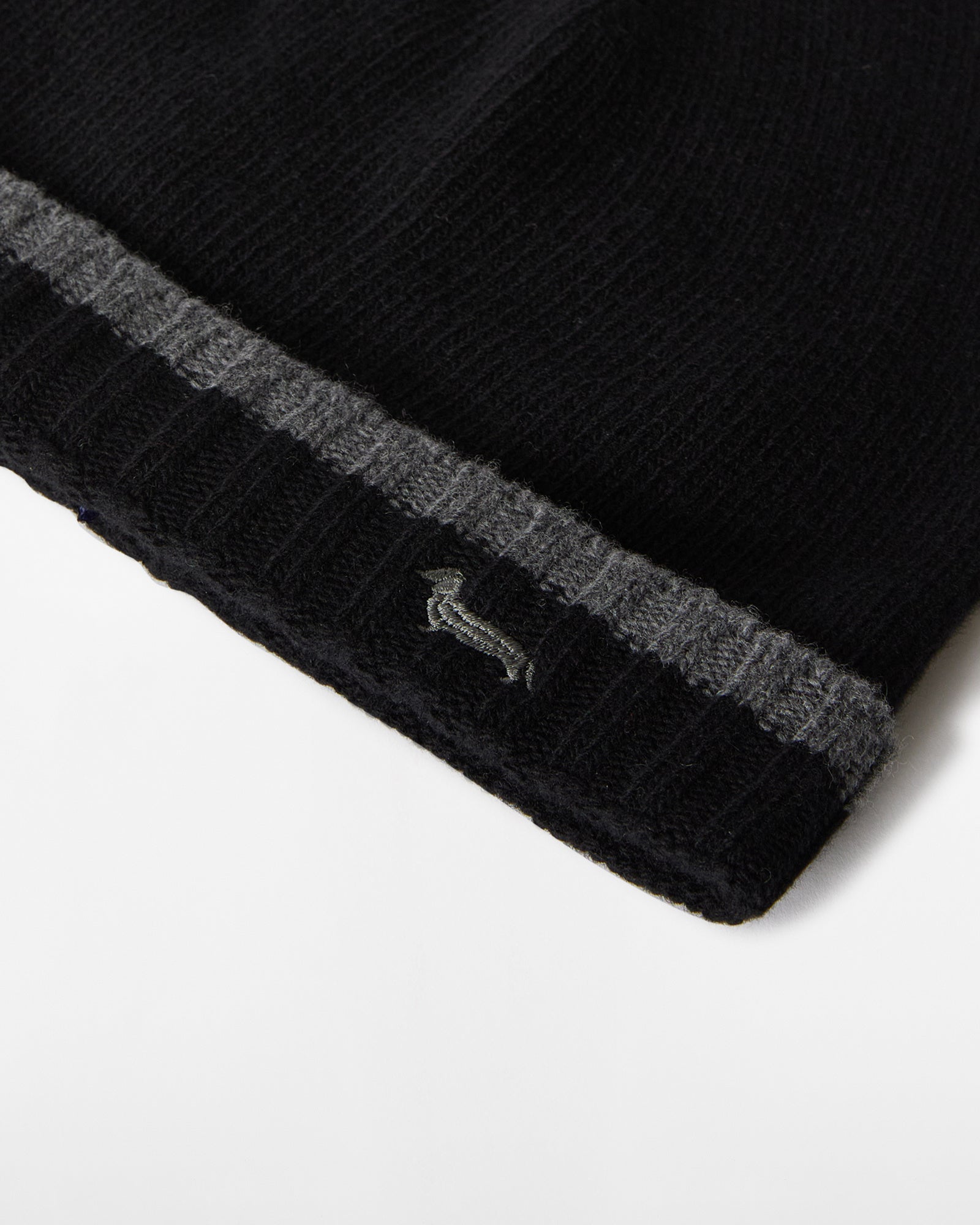 Realizzato in caldo misto lana e cashmere, questo beanie da uomo firmato Harmont & Blaine è pronto a conferire un tocco di personalità ai vostri outfit invernali. L'accessorio, dall'aspetto sobrio ed essenziale, è ravvivato da un risvolto lavorato a coste e rifinito da un righino a contrasto sul bordo, accompagnato dall'immancabile bassotto Blaine ricamato anch'esso a contrasto.