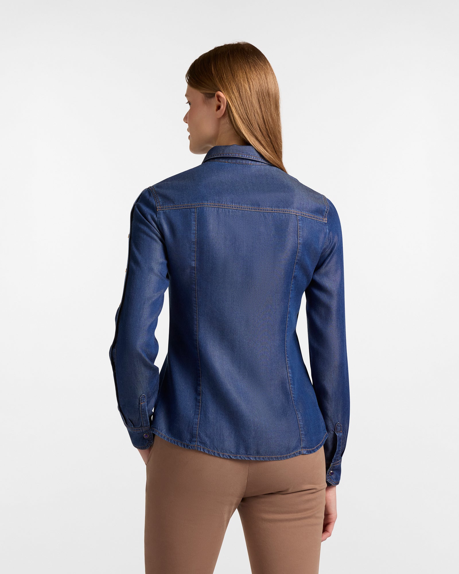 Perfetta per completare i vostri look di tutti i giorni, questa camicia da donna firmata Harmont & Blaine dall'effetto denim è realizzata in Chambray di puro lyocell, un tessuto morbido e liscio rispettoso dell'ambiente. Il modello si presenta in una vestibilità slim leggermente più aderente, ed è caratterizzato da un'innovativa apertura con bottoni lungo tutta la manica e da un taschino con patta e bottone sul petto rifinito dall'iconico bassotto Blaine. Il design è completato dall'immancabile tocco di vivacità di Harmont & Blaine, dato dal motivo rigato a contrasto all'interno dei polsi.