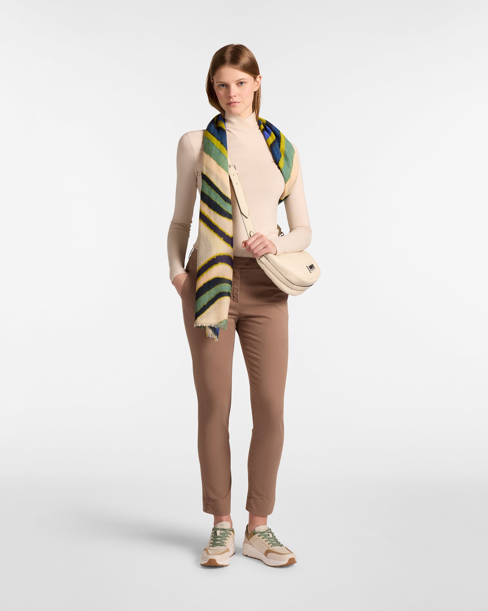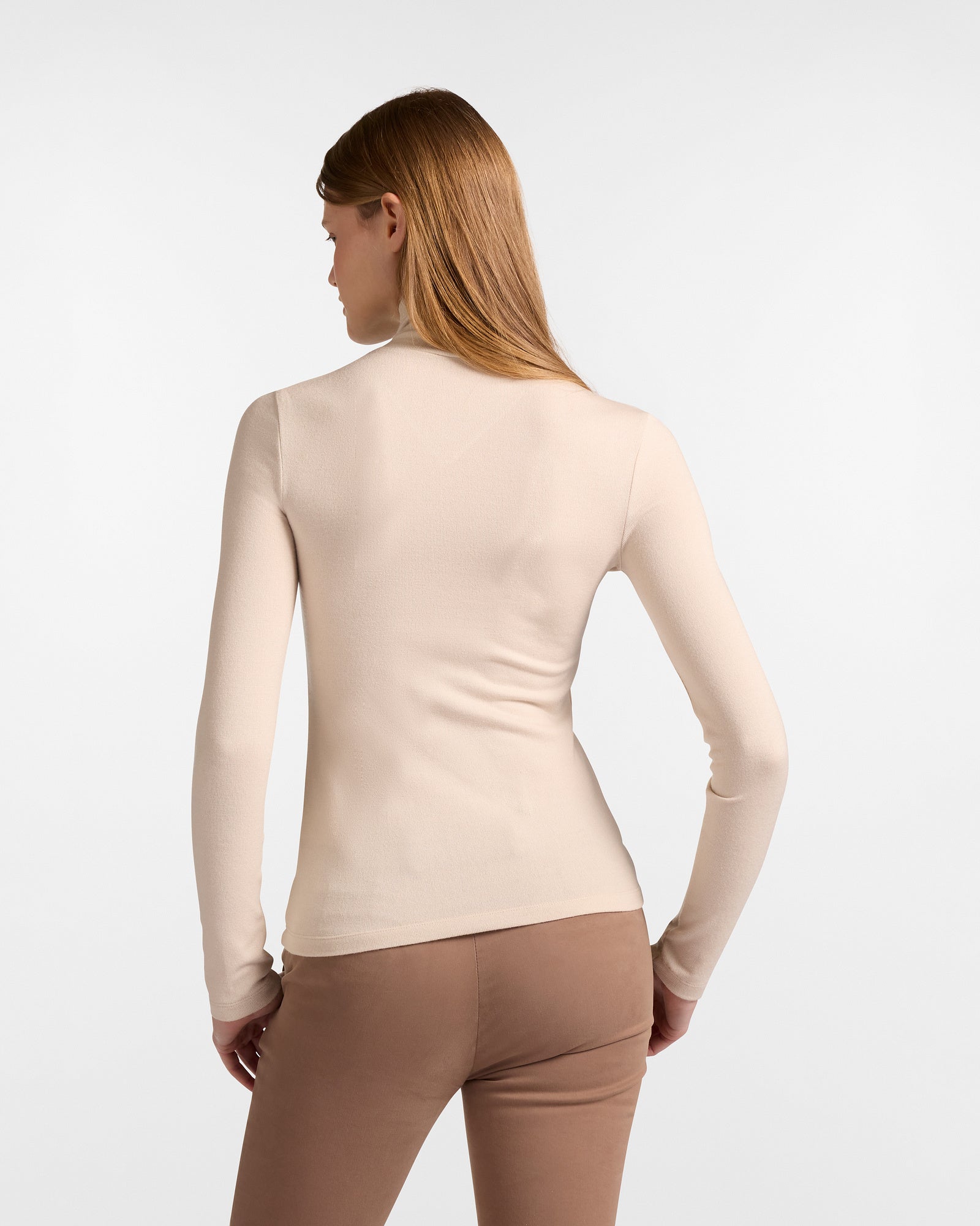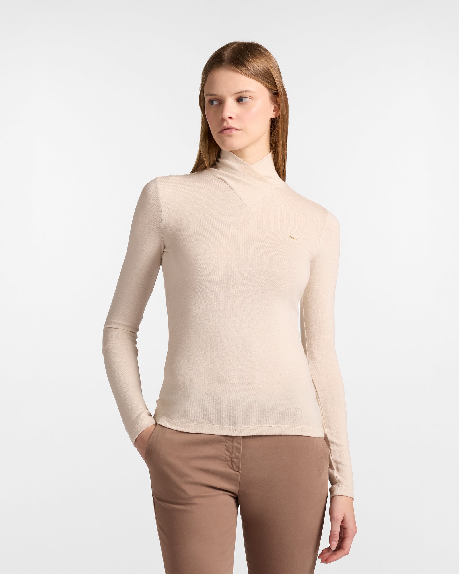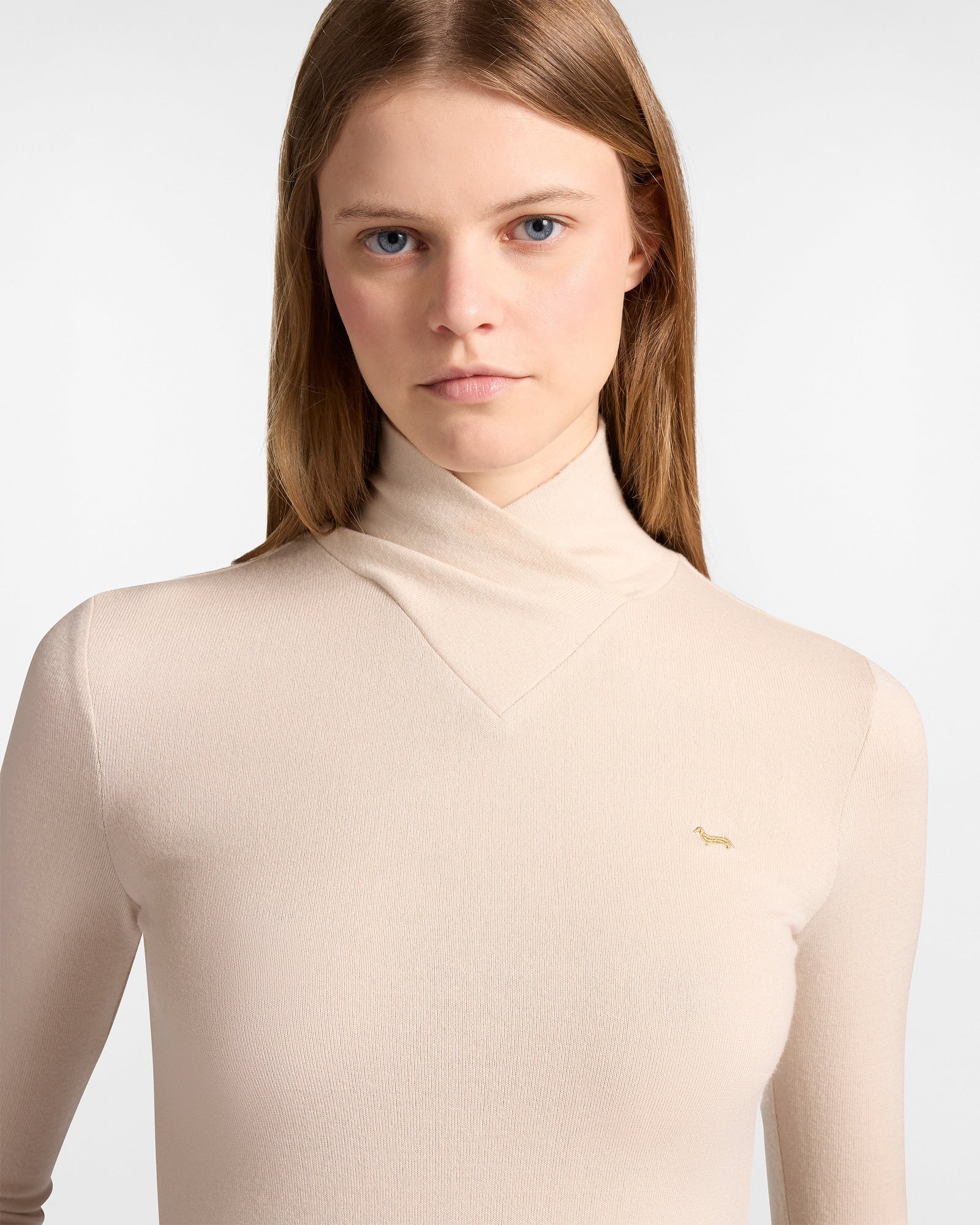 Linee essenziali e dettagli ricercati definiscono il design di questa maglia a maniche lunghe. Il collo alto incrociato sul davanti aggiunge un tocco di eleganza contemporanea, rendendo il capo ideale da indossare da solo o sotto blazer e giacche. Il logo del bassotto ricamato tono su tono sul petto completa il modello con discreta raffinatezza. Una proposta versatile, perfetta per affrontare la stagione con stile e comfort.