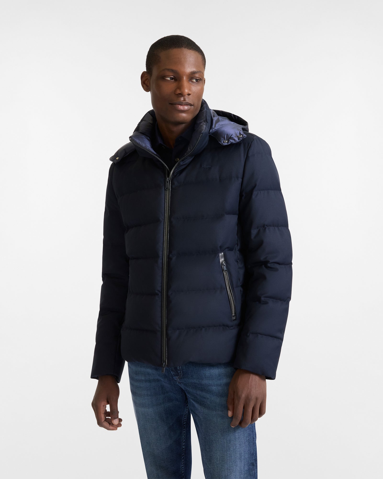 Particolarmente indicato per le giornate più fredde, questo piumino da uomo in lana tecnica presenta un design pratico e raffinato al tempo stesso, perfetto sia per essere indossato in città sia per accompagnarvi durante una gita fuori porta. Il capo, con imbottitura in vera piuma, presenta due tasche laterali con zip, una chiusura con zip a doppio cursore e un comodo cappuccio con bottoni dal finish lucido a contrasto, mentre l'interno, dotato di due comode tasche con zip, rivela un dinamico motivo a righe. A rifinire il modello non può mancare l'iconica mascotte del brand, il bassotto, qui ricamato in tono sul petto.