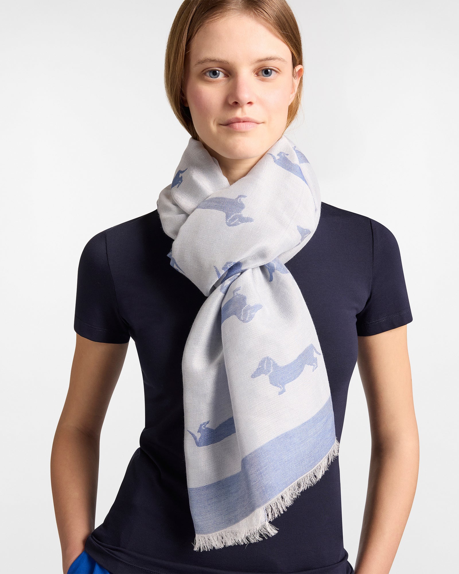Questa giocosa sciarpa da donna, realizzata in morbido e leggero misto modal, diventerà l'accessorio perfetto per donare un pizzico di brio ai vostri look quotidiani. L'accessorio è decorato da un motivo jacquard con bassotti all over, per un divertente omaggio all'iconica mascotte di Harmont & Blaine, ed è rifinito da un bordo a contrasto dai lati più corti leggermente sfrangiati.